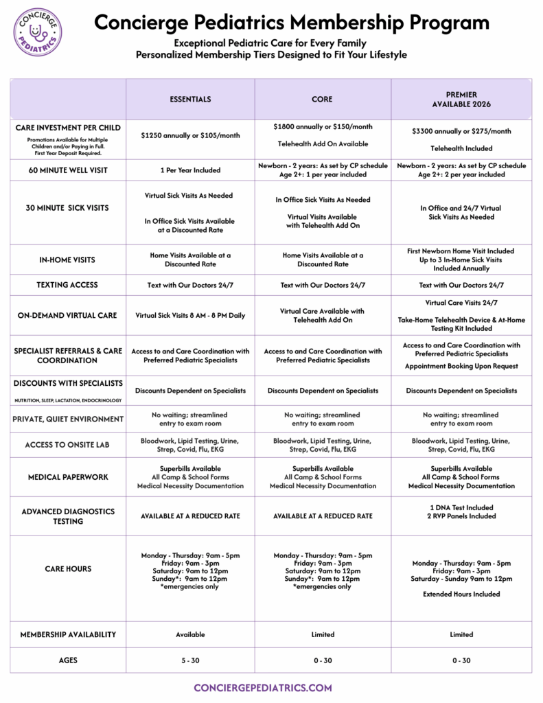 Think of us as more than just your pediatrician. We are concierges in the medical field, offering our knowledge and strong relationships to our members. Whether it is an ankle injury that may need an orthopedist while on vacation, a possible gastrointestinal issue that needs a specialist, or a deep cut that needs a plastic surgeon on a Saturday night, Concierge Pediatrics will guide you and help make the necessary connections to other professionals, so that you can be seen as quickly as possible.