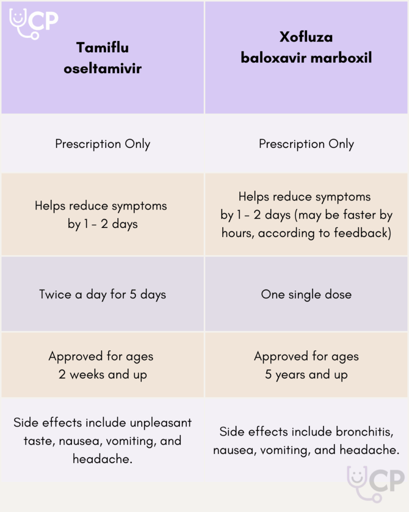 The flu is a virus, so antibiotics will not help you recover, as those are targeted to treat bacteria. However, some people may want to opt for a prescription anti-viral treatment, like oseltamivir (i.e.; Tamiflu) or baloxavir marboxil (i.e.; Xofluza). These medications are most effective when taken within 48 hours of symptom onset. Some of the drawbacks of these medications include reported unpleasant side effects, like a strong, bitter taste, nausea, vomiting, and sometimes confusion or bronchitis. For this reason, the drugs are usually recommended for immunocompromised individuals, and those under age 5 or over age 65. The benefit is that these drugs may reduce the duration of your symptoms when taken right away. Discuss the pros and cons with your healthcare provider so you can make the decision that’s best for your family!